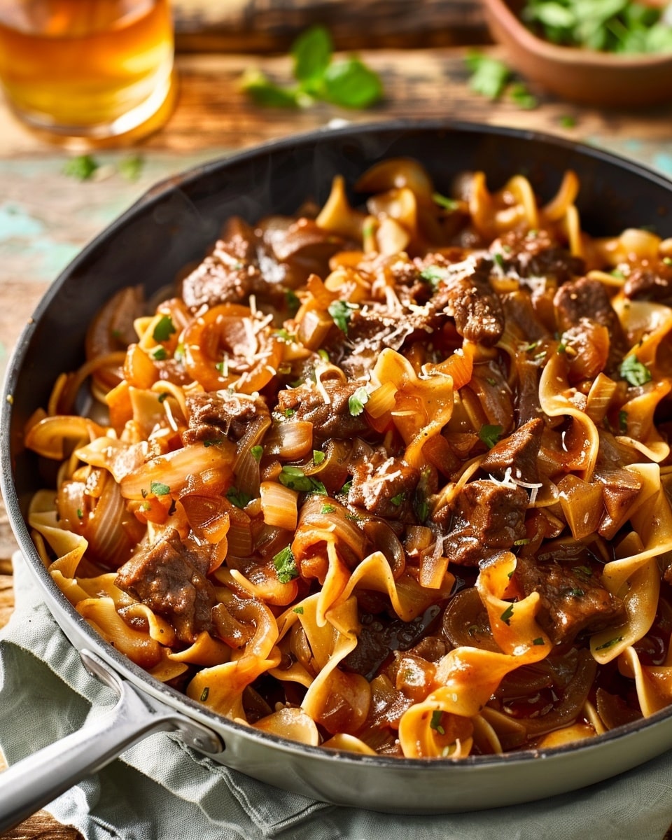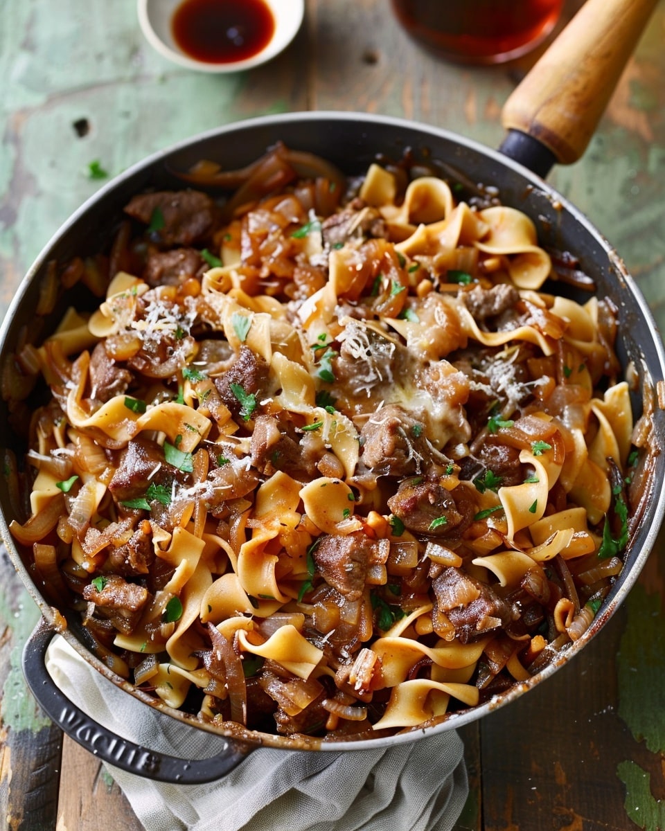 French Onion Beef and Noodles is a cozy, one-pot dinner that blends the savory richness of French onion soup with hearty beef and tender egg noodles. With a creamy, flavorful sauce and caramelized onions, this easy comfort food is perfect for weeknights or family dinners.