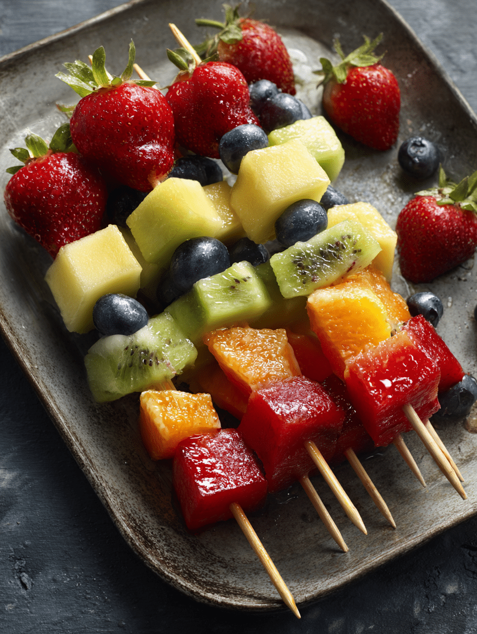 Sometimes I drizzle the skewers with a bit of honey-lime glaze or sprinkle them with chopped mint for extra flavor. For a tropical twist, I use mango, papaya, and coconut chunks. I’ve also made dessert-style skewers with marshmallows and a drizzle of chocolate or paired them with a cream cheese fruit dip.