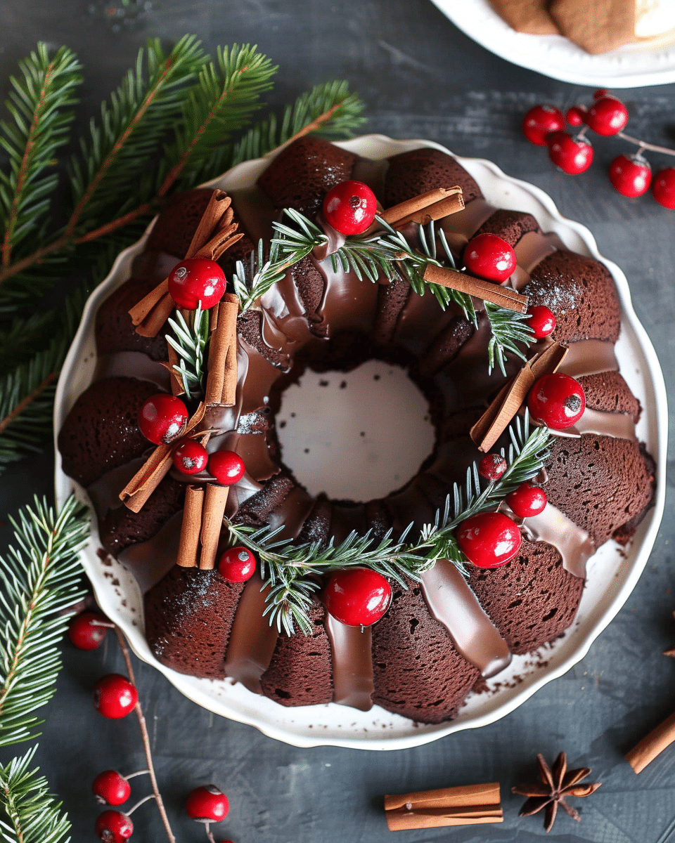 PrintGingerbread Chocolate Bundt Cake Christmas Wreath