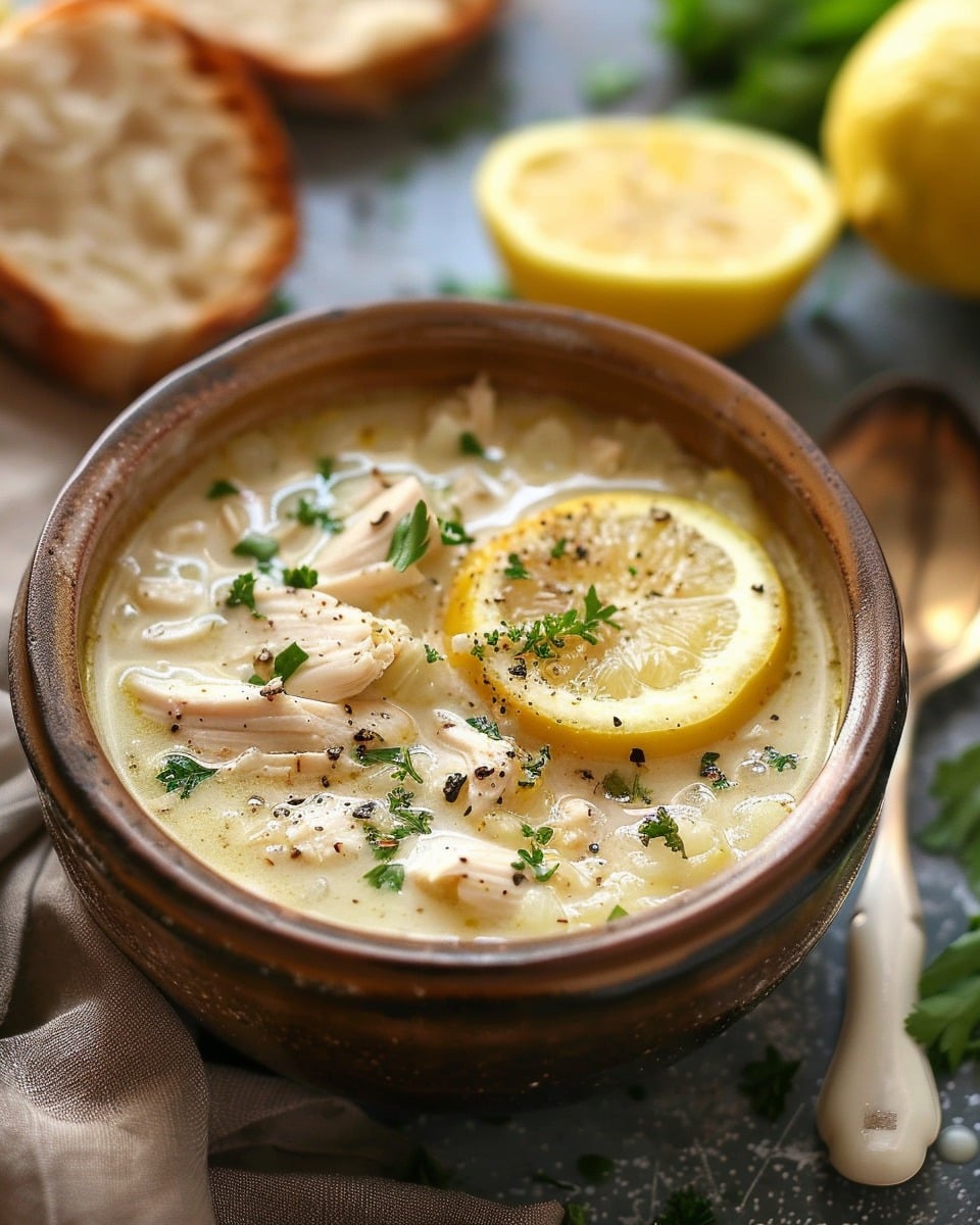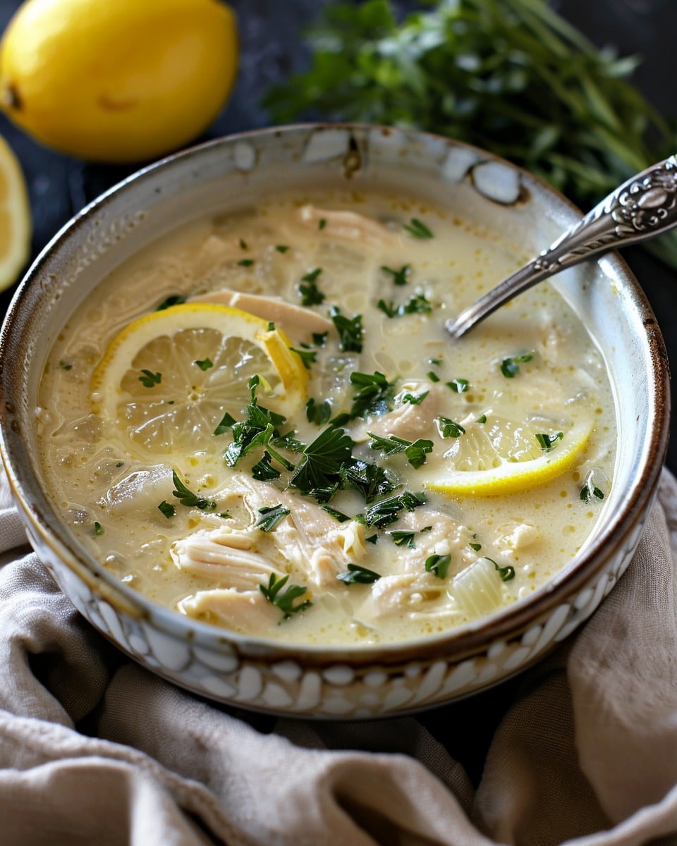 A comforting and refreshing Greek-style soup made with tender chicken, bright lemon, and a silky egg-enriched broth for a light yet satisfying dish.