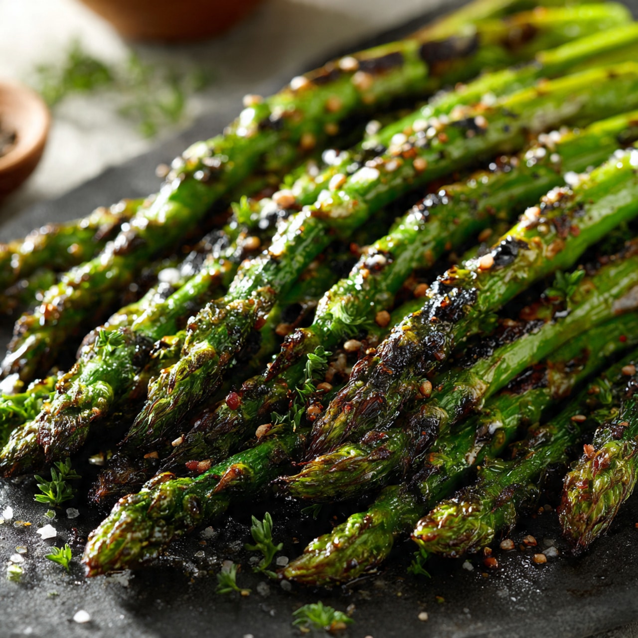 A quick and flavorful grilled asparagus recipe with a slightly smoky char, enhanced with garlic, olive oil, and a splash of fresh lemon juice.