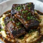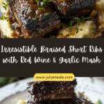 Braised short ribs with red wine and garlic mash is a luxurious, slow-cooked meal featuring fall-apart tender beef simmered in a rich, wine-infused sauce, served over creamy, garlicky mashed potatoes. It’s comforting, elegant, and packed with deep, savory flavor.