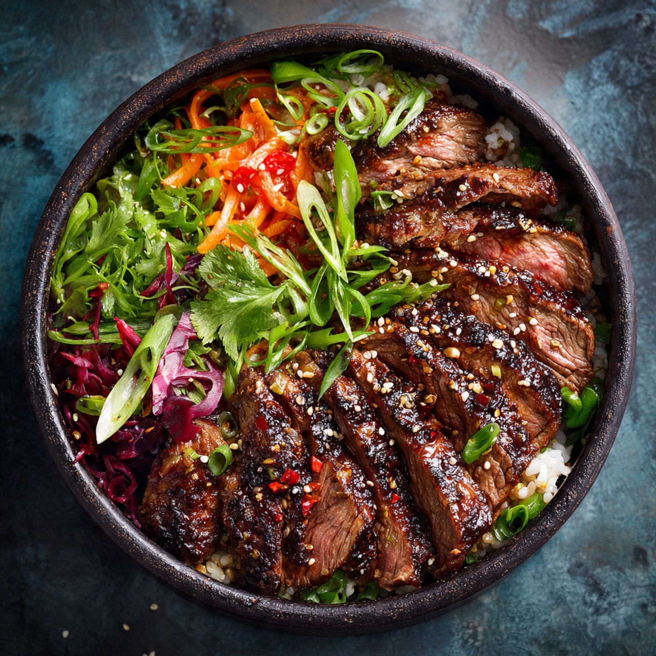 Bold and flavorful Korean BBQ Steak Bowls featuring tender marinated steak cooked until caramelized and served over warm rice with crisp vegetables. This savory-sweet dish delivers smoky, slightly spicy flavors in a vibrant and satisfying bowl.