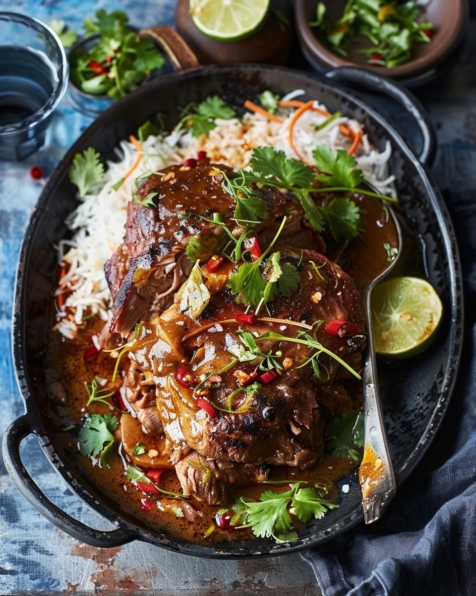 This fall-apart tender Massaman Lamb Shoulder is slow-roasted in a rich Thai curry sauce with coconut milk, potatoes, and warm spices. Perfect for entertaining, this hands-off dish delivers deep, savory flavor with a touch of sweetness. A stunning centerpiece with minimal effort—leftovers taste even better the next day.