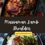 I present to you a gorgeous, melt‑in‑the‑mouth lamb shoulder cooked in a rich Massaman curry sauce. The meat falls apart with the gentlest tug of a fork, and the curry is lusciously savory, slightly sweet, with warm spices that complement the lamb beautifully.