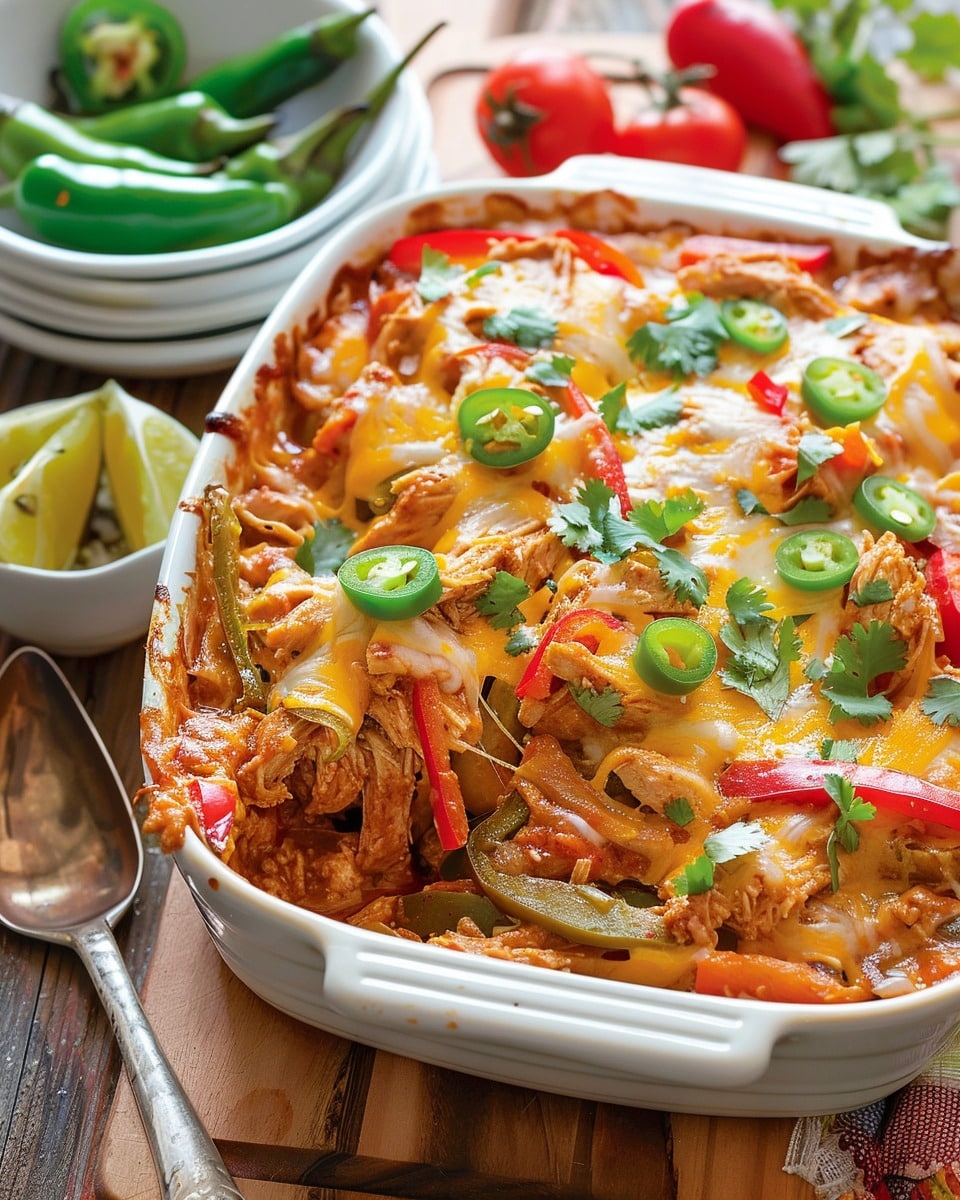 A bold and comforting Mexican Chicken Fajita Casserole that combines seasoned chicken, colorful vegetables, rice, and melted cheese in an easy oven-baked dish perfect for busy nights or feeding a crowd.