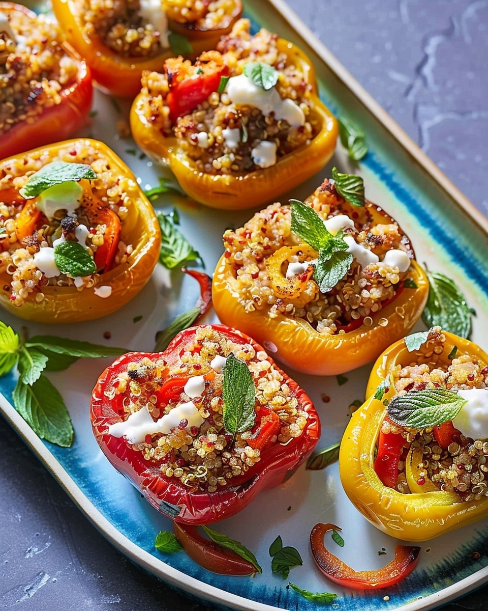 I stuff each pepper half with the quinoa mixture, cover the dish with foil, and bake for 25–30 minutes until the peppers are tender.