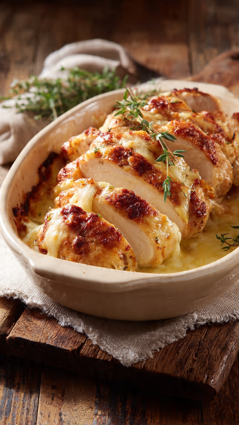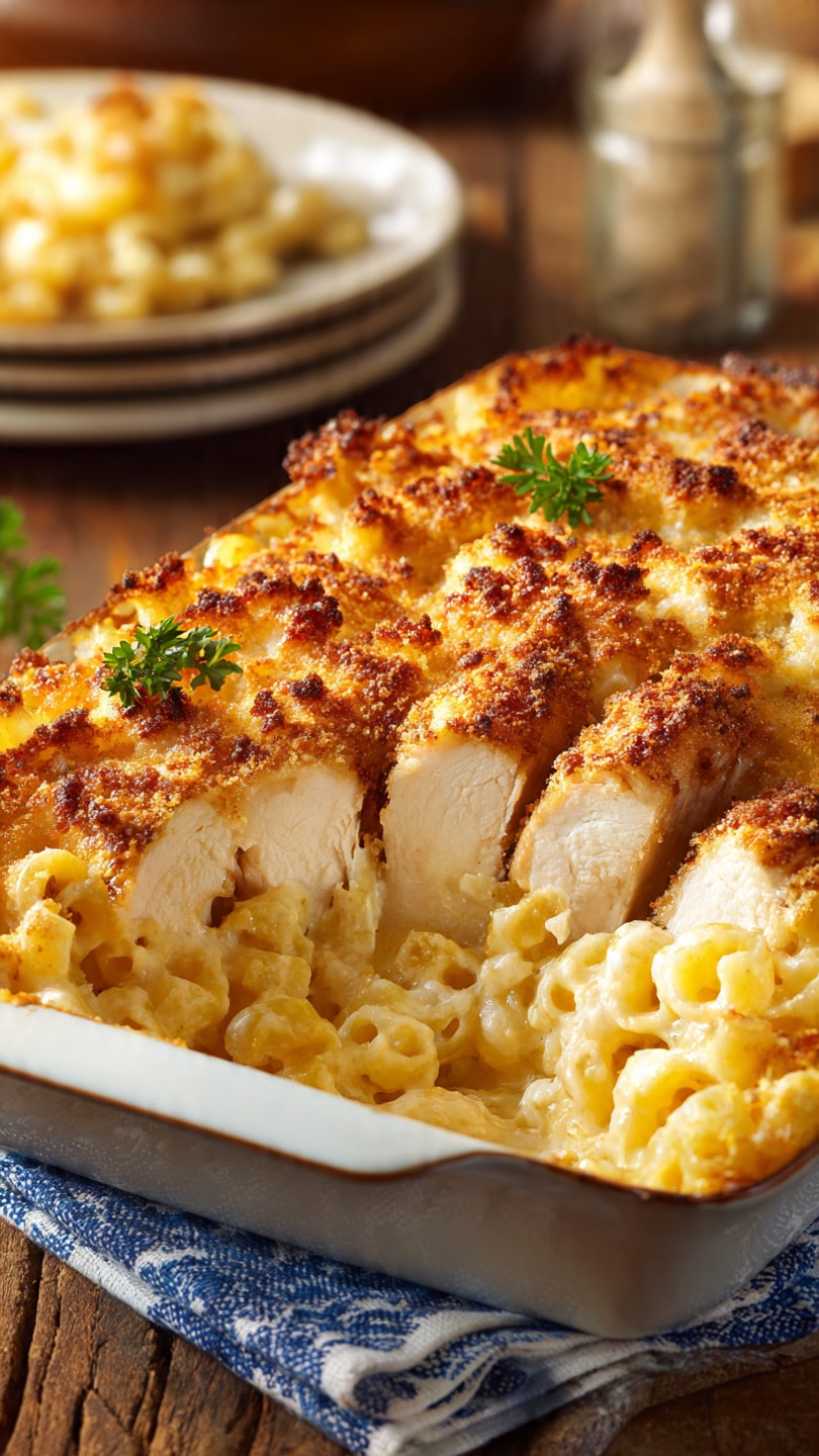 - Bake uncovered for 30–35 minutes, or until chicken is fully cooked and topping is bubbly and golden.