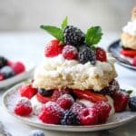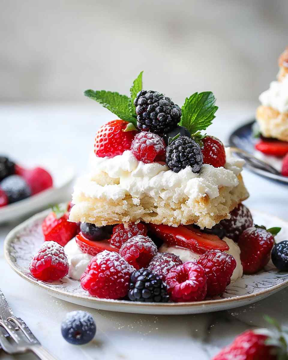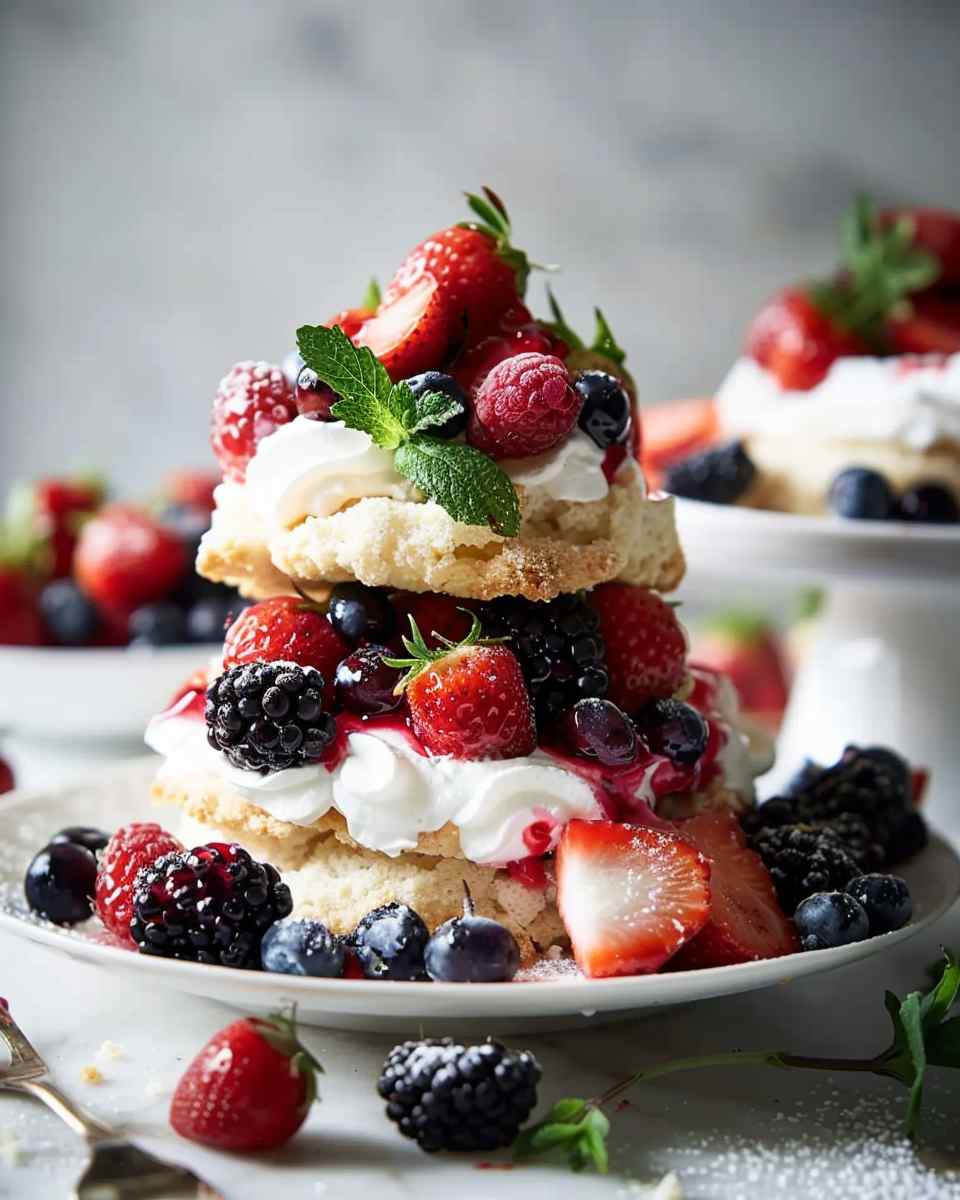A fresh and light mixed berry shortcake featuring tender golden biscuits layered with juicy berries and fluffy whipped cream, perfect for warm days and special occasions.