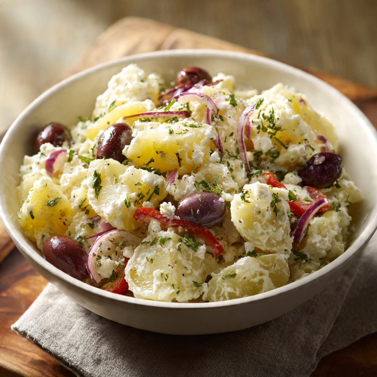 A fresh Mediterranean-style potato salad made with tender potatoes, Kalamata olives, crisp vegetables, feta cheese, and a light olive oil and red wine vinegar dressing.