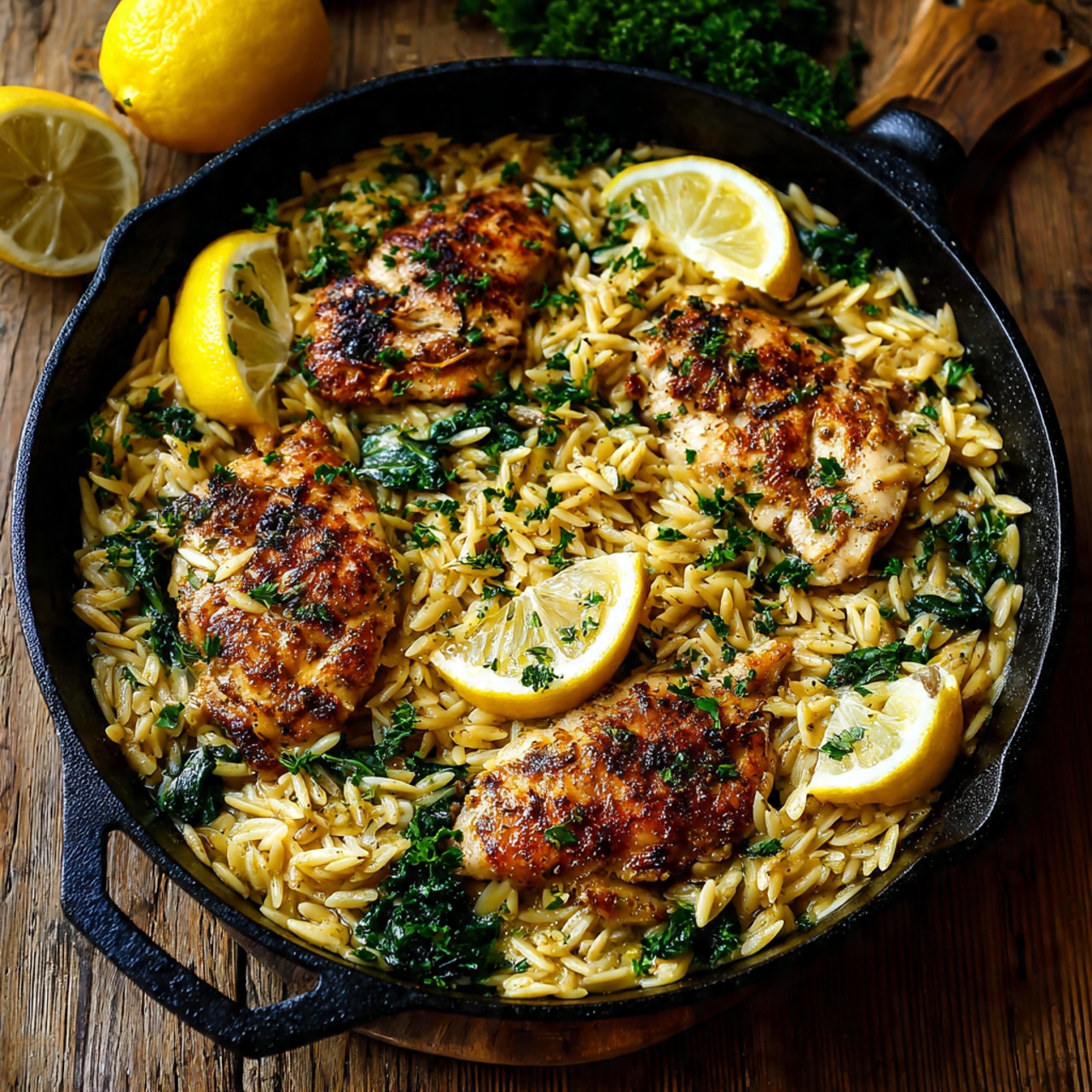 A comforting one-skillet dish featuring tender chicken and creamy orzo cooked in a rich lemon butter sauce, perfectly balanced with fresh, bright flavors.
