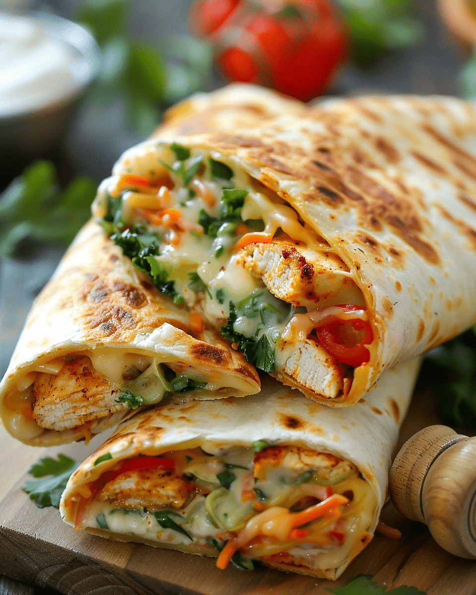Ooey‑Gooey Cheesy Garlic Chicken Wraps are warm, comforting tortillas filled with garlic‑sautéed chicken and melted cheese for a rich, satisfying meal. They combine savory, cheesy, and buttery flavors with a crisp, toasted tortilla, making them perfect for a quick lunch, simple dinner, or indulgent snack.