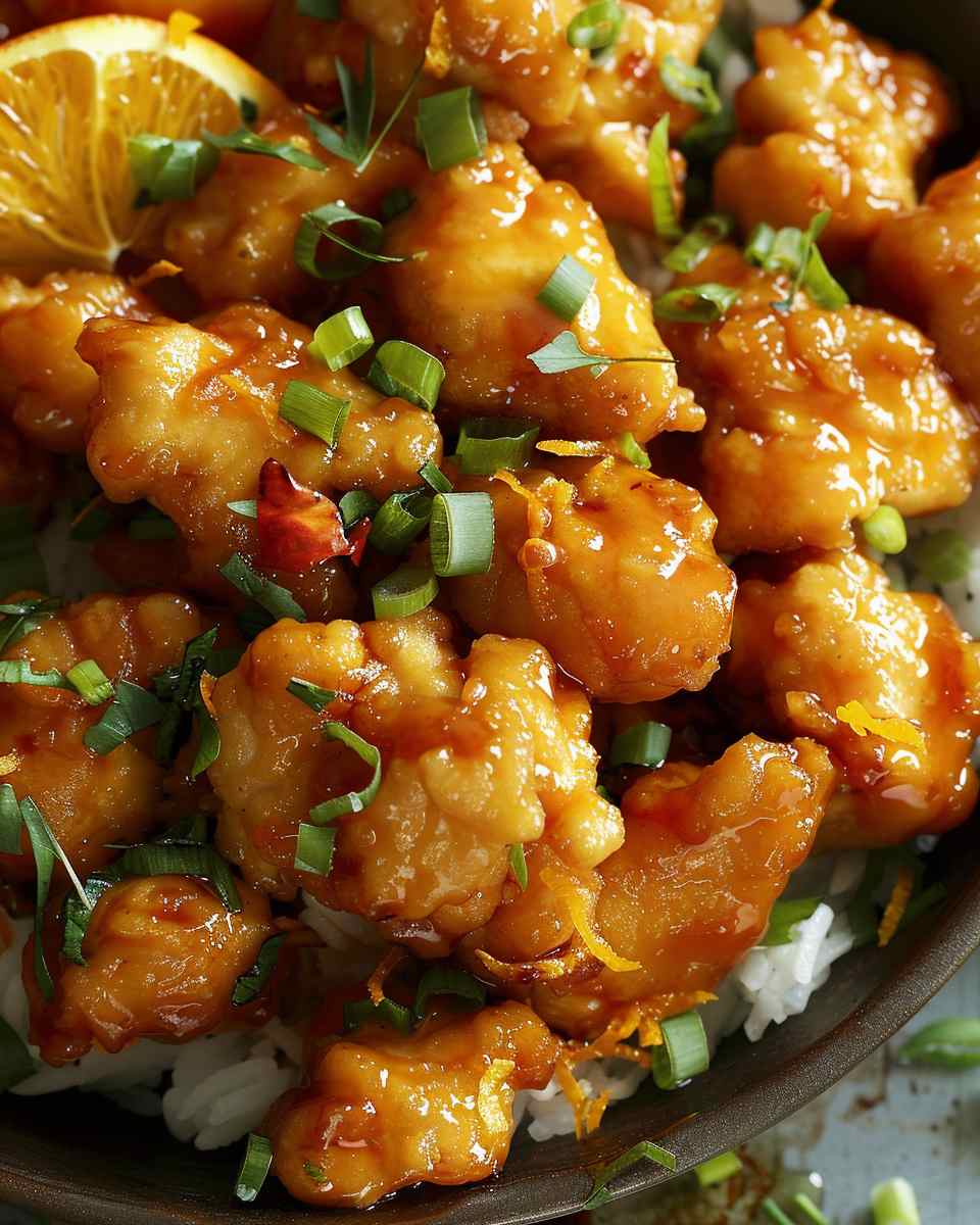 A crispy and flavorful orange chicken coated in a sweet, tangy, and savory citrus sauce, perfect as a homemade takeout-style dish.