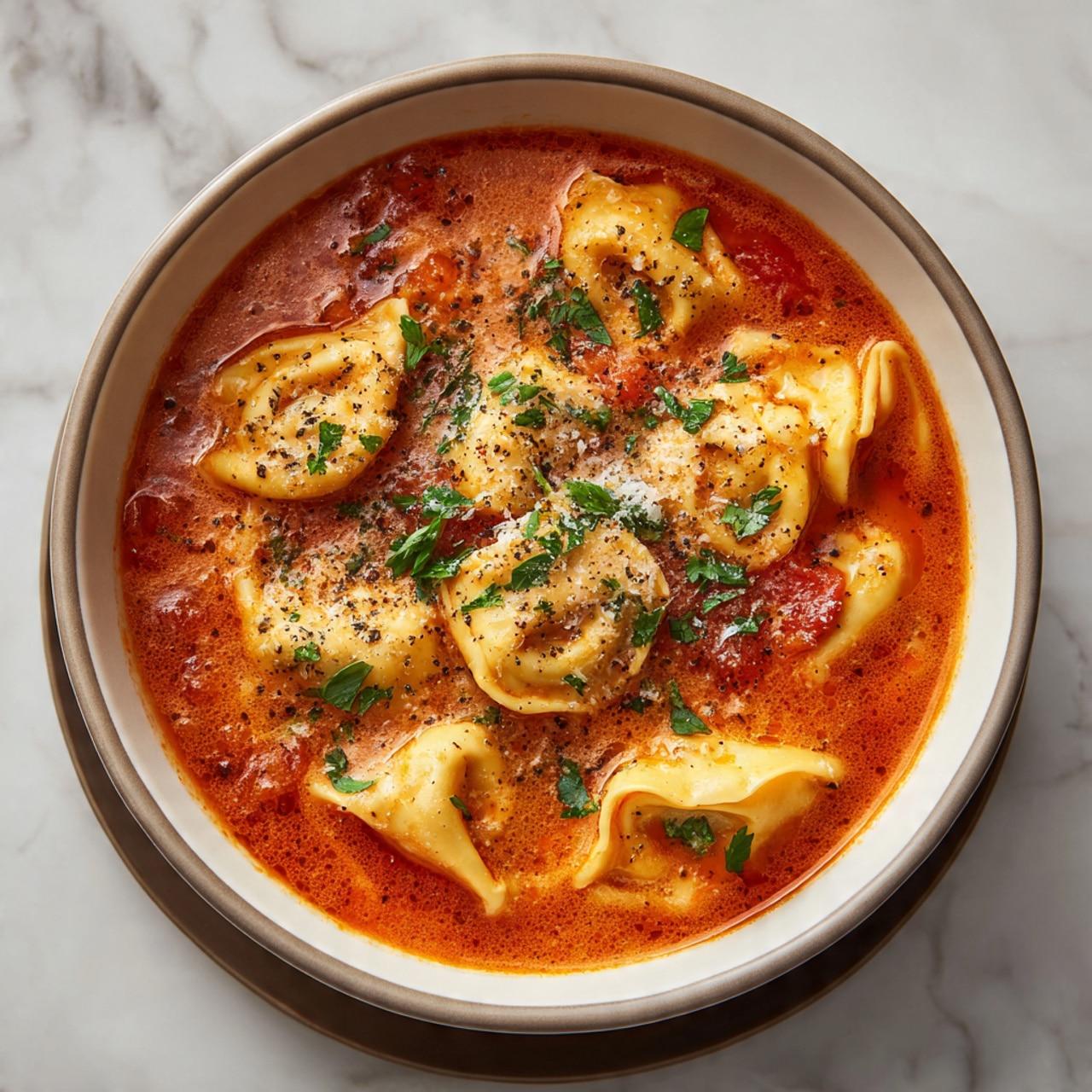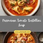 A cozy and comforting Parmesan tomato tortellini soup featuring tender cheese-filled tortellini simmered in a rich tomato broth with Italian herbs and finished with savory Parmesan for a hearty, satisfying meal.
