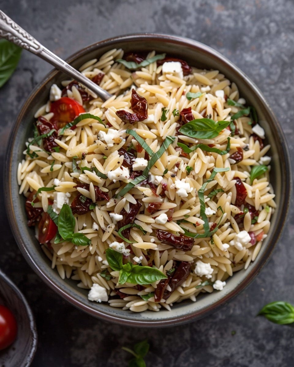 A light yet satisfying orzo pasta salad packed with tender orzo, salty feta, tangy sun dried tomatoes, and fresh herbs—all tied together with a lemony olive oil dressing. Perfect for potlucks, lunches, or easy meal prep.