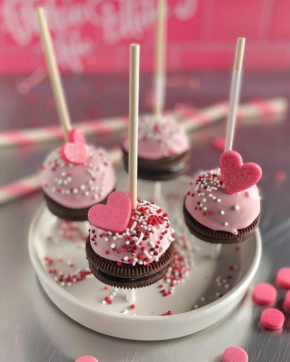 Pinky Oreo Pops are a fun, no-bake treat made with Oreos dipped in pink-colored chocolate and decorated with sprinkles. They’re perfect for parties, birthdays, or festive gifts.