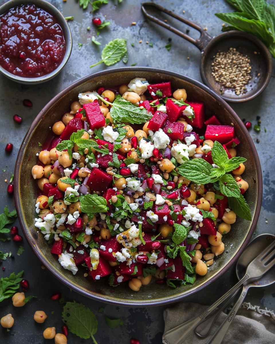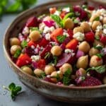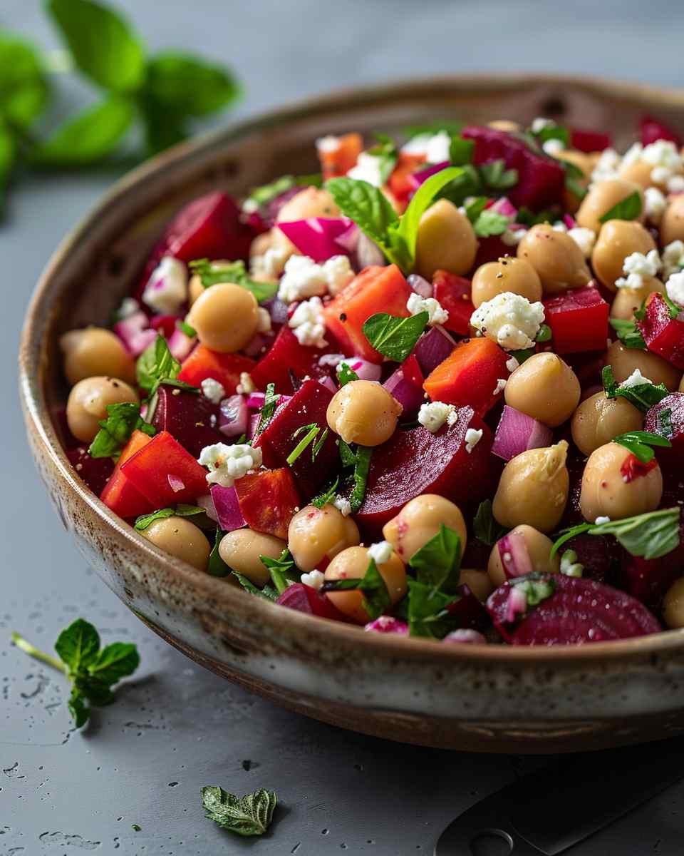 A refreshing and colorful salad combining hearty chickpeas, earthy beets, creamy feta, and crisp vegetables, all tossed in a light tangy dressing.