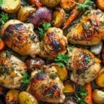 Roasted Garlic Chicken and Vegetables is a one-pan dinner that’s hearty, healthy, and full of flavor. Juicy chicken thighs, tender potatoes, carrots, and sweet roasted garlic are seasoned with herbs and baked until golden and caramelized. This easy sheet pan chicken recipe is perfect for weeknight meals or cozy Sunday dinners—with minimal cleanup!