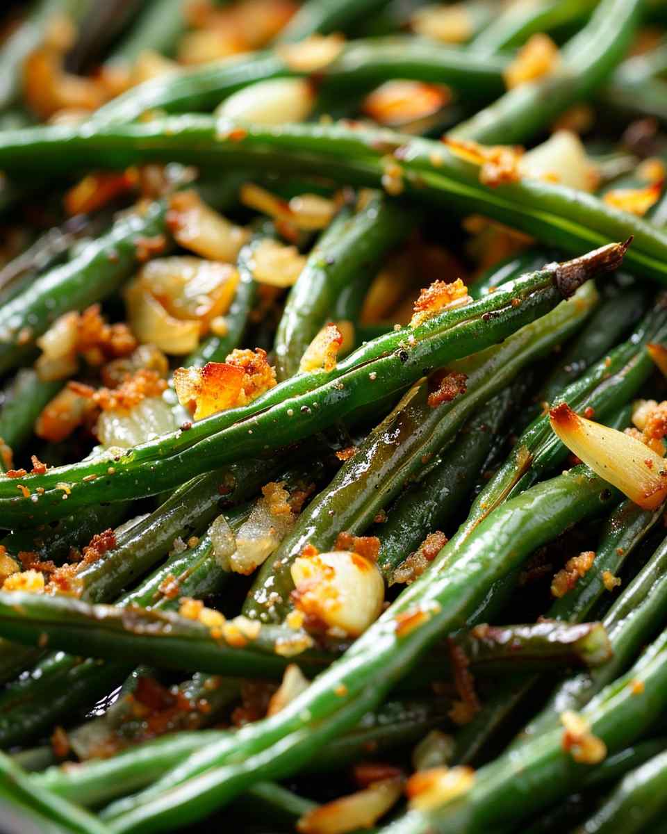 A simple and flavorful side dish featuring tender roasted green beans with crispy edges, enhanced by savory garlic and a hint of freshness.