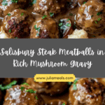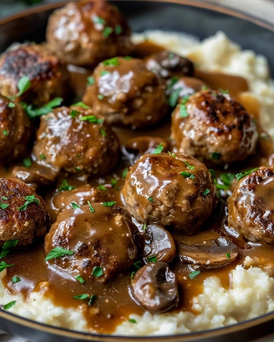 Salisbury Steak Meatballs in Rich Mushroom Gravy are a hearty, bite-sized twist on the classic comfort food dish. Juicy meatballs simmer in a velvety, savory mushroom gravy — perfect for serving over mashed potatoes, rice, or noodles for a cozy and satisfying meal.