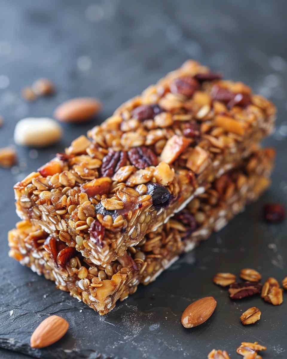 Wholesome and chewy granola bars made with quinoa, oats, and a hint of salt, offering a perfect balance of sweet and crunchy textures.