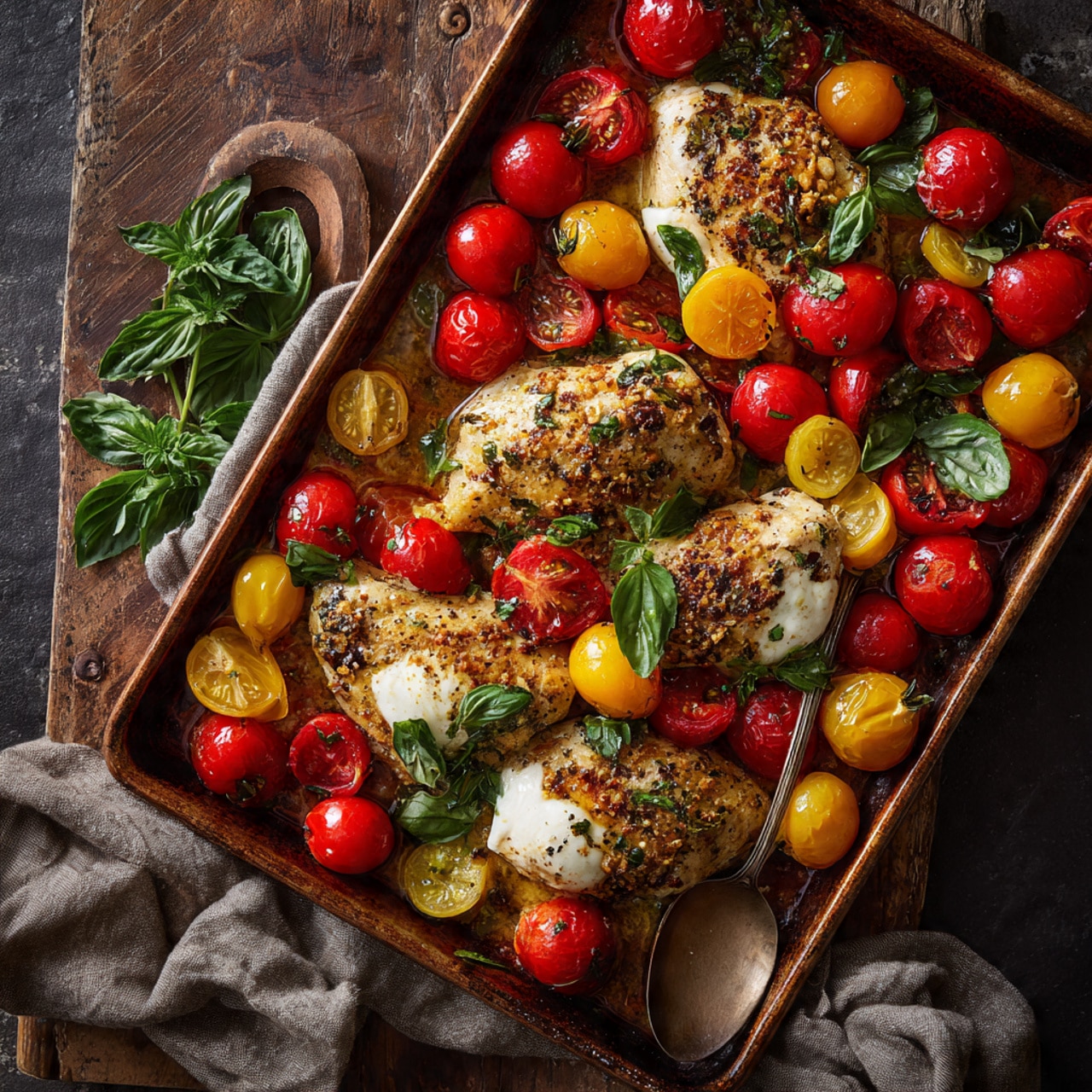 Juicy baked chicken topped with fresh mozzarella, roasted cherry tomatoes, and fragrant basil for a simple and vibrant Caprese-inspired sheet pan dinner.
