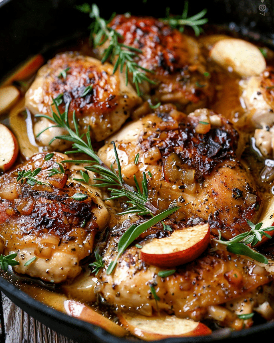 Skillet apple cider chicken is a one-pan dish featuring juicy seared chicken simmered in a sweet and savory apple cider glaze with garlic, mustard, and herbs. This comforting, seasonal meal is perfect for cozy dinners or festive gatherings.