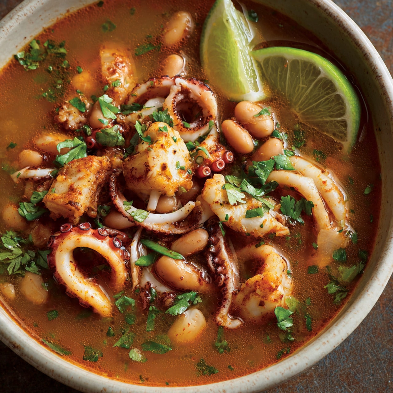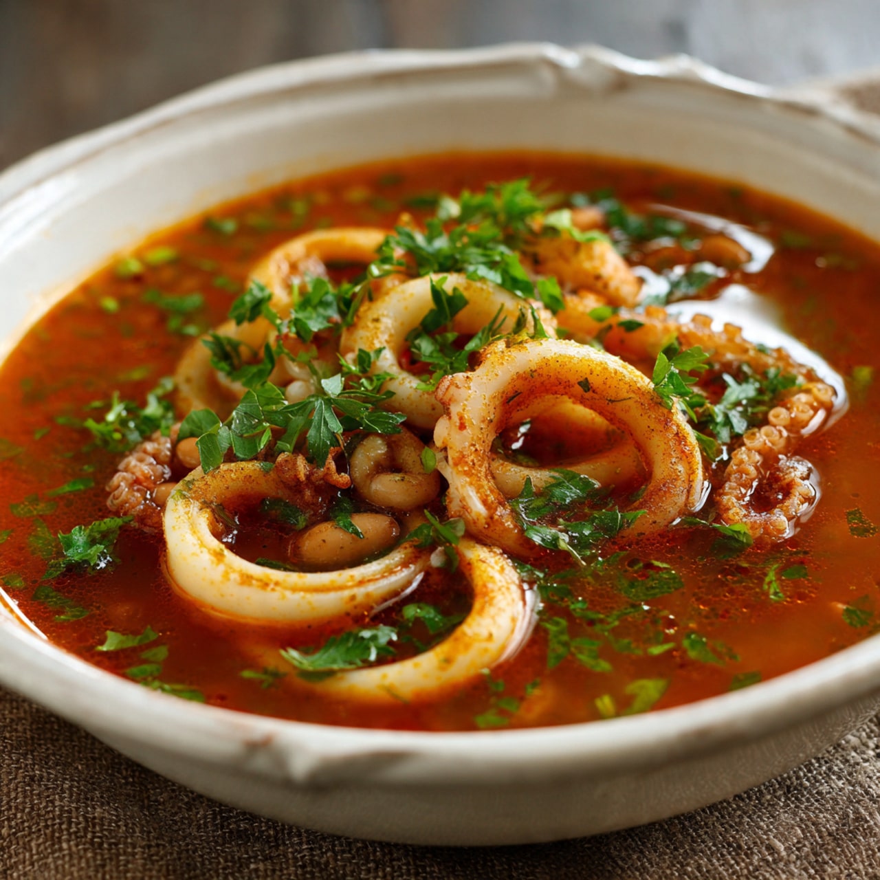 A bold and hearty seafood soup featuring tender calamari simmered in a spiced tomato broth with creamy white beans for a rustic and comforting meal.