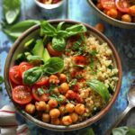 A nourishing and flavorful plant-based bowl featuring fluffy quinoa, crispy spiced chickpeas, and fresh vegetables, finished with a zesty dressing.