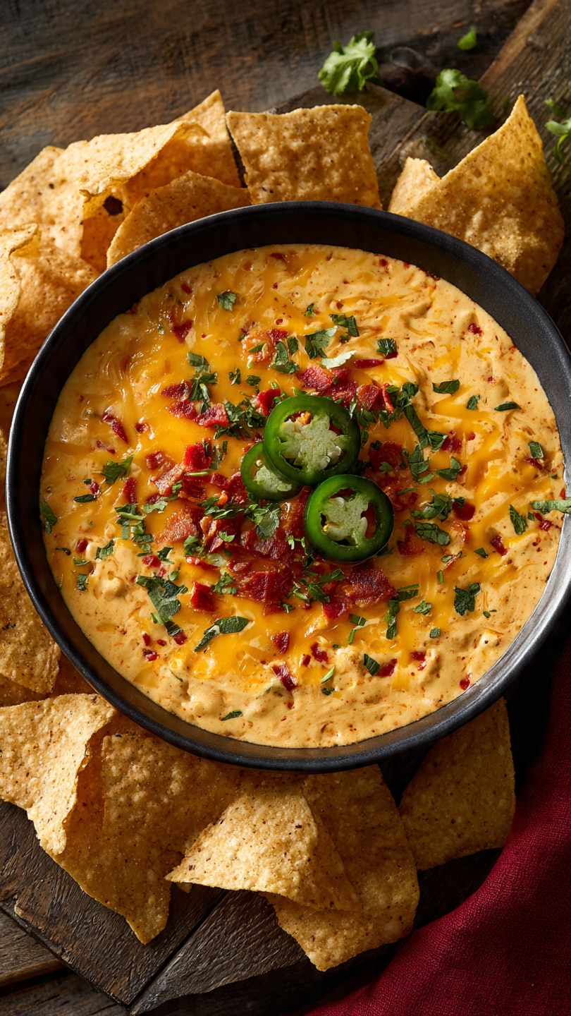 - Serve warm with tortilla chips or use as a topping for nachos, burgers, or fries.