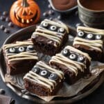 Spooky mummy brownies are a fun and festive Halloween treat that’s as easy to make as it is adorable. I start with rich, fudgy brownies and decorate them with white chocolate “bandages” and candy eyes to turn them into spooky little mummies — perfect for parties or Halloween night!