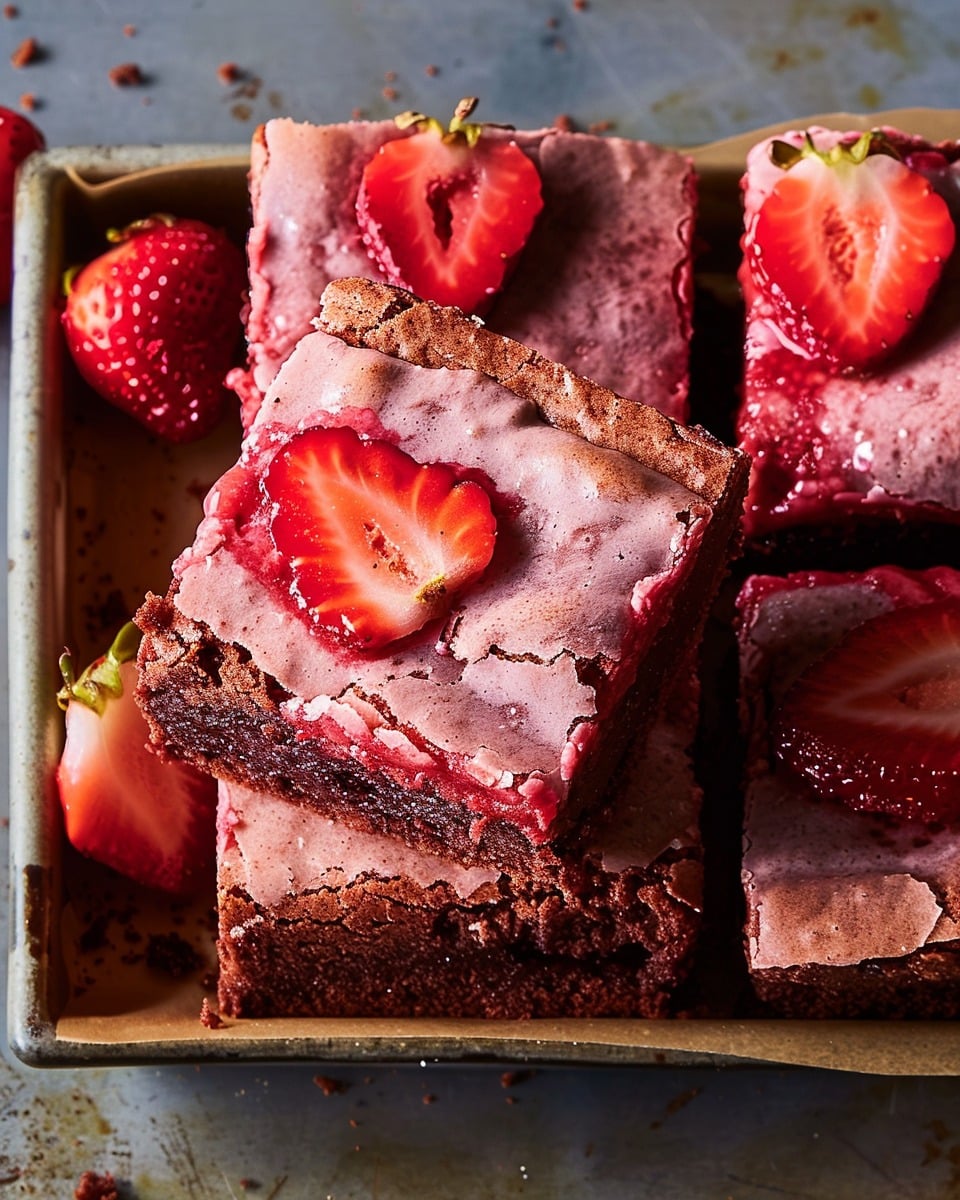 If I’m using glaze, I whisk together powdered sugar, a splash of milk, and a drop of strawberry extract or juice, then drizzle it over the cooled brownies.