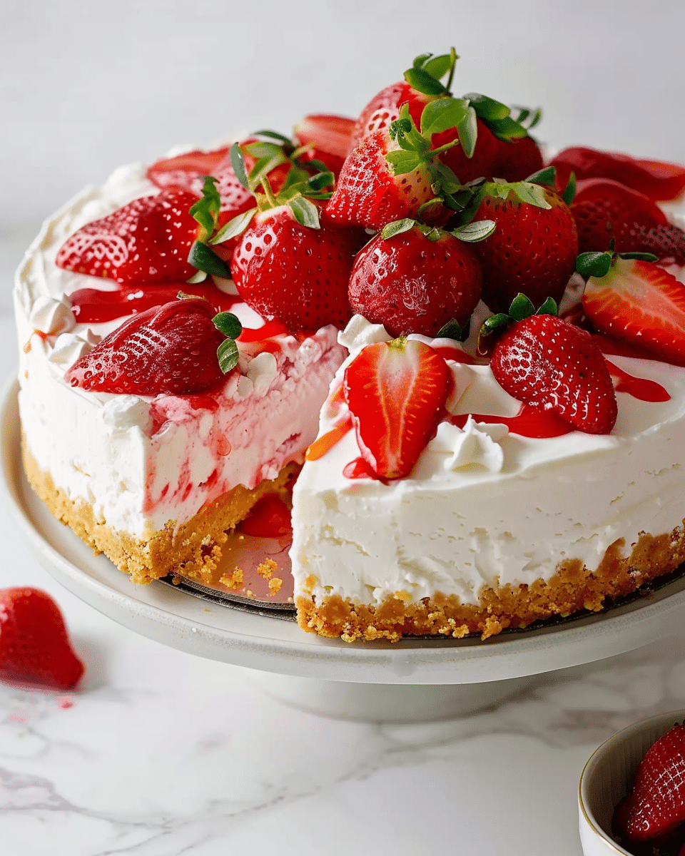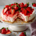 Strawberry Cheesecake is a rich and creamy dessert featuring a buttery graham cracker crust, velvety cheesecake filling, and a sweet fresh strawberry topping—perfect for any special occasion or when you’re craving something fruit‑filled and indulgent.
