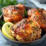 Sometimes I add crushed red pepper flakes for a little heat or toss in some fresh rosemary or thyme for a herby twist. I’ve also swapped the lemon for lime when I want a slightly different citrus flavor. When I want an extra crispy finish, I broil the thighs for the last 2–3 minutes. For a complete one-pan meal, I add baby potatoes or vegetables to the baking sheet alongside the chicken.