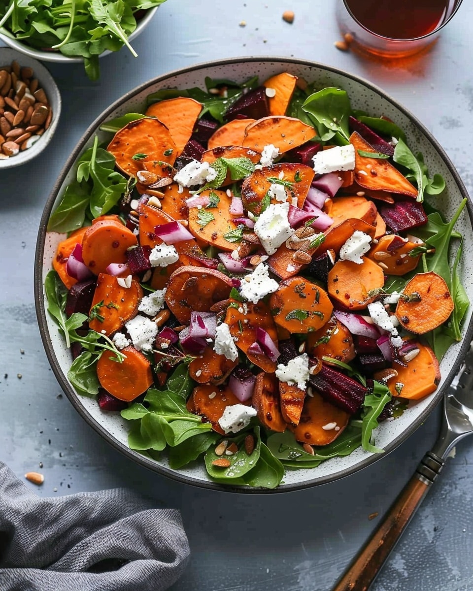 I love how this salad brings together warm roasted vegetables and fresh ingredients in one bowl. It’s hearty enough to stand on its own as a meal but also makes a beautiful side dish. The sweet potatoes and beets give it depth, while the dressing brightens it all up.