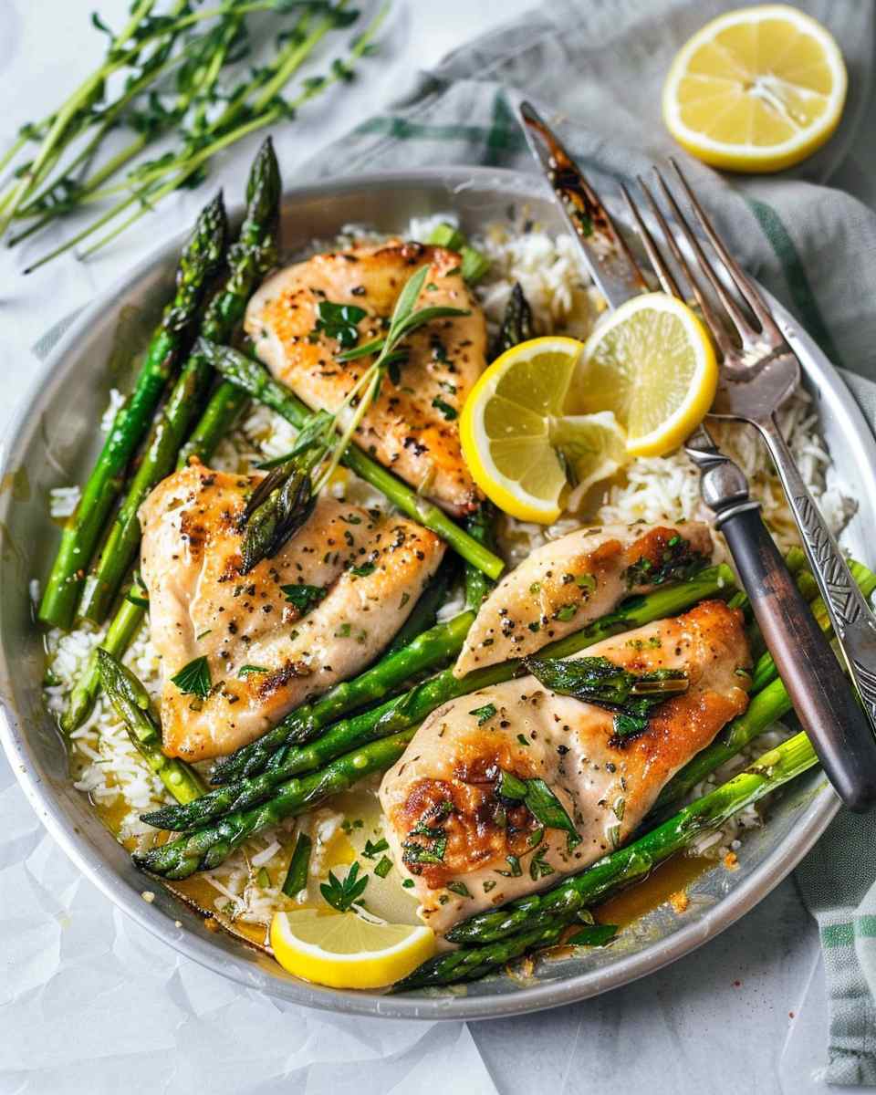 An elegant yet easy tarragon chicken dish served with tender asparagus and a light, flavorful herb sauce.