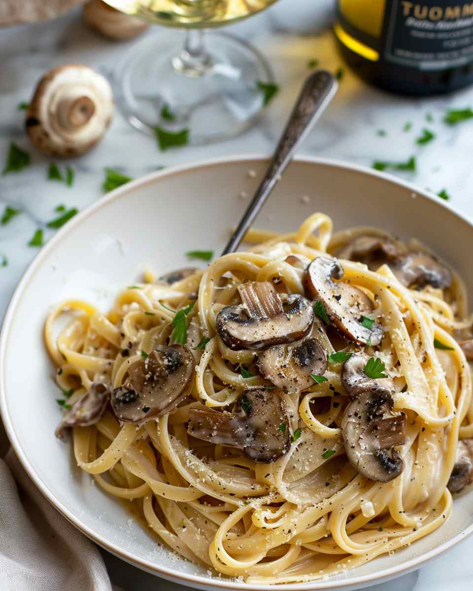 A rich and elegant pasta dish featuring earthy mushrooms and a creamy truffle-infused sauce, perfect for a comforting yet refined meal.