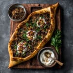 Turkish Beef Pide is a traditional boat-shaped flatbread filled with seasoned ground beef, vegetables, and aromatic spices, baked until golden with crisp edges and a soft interior.