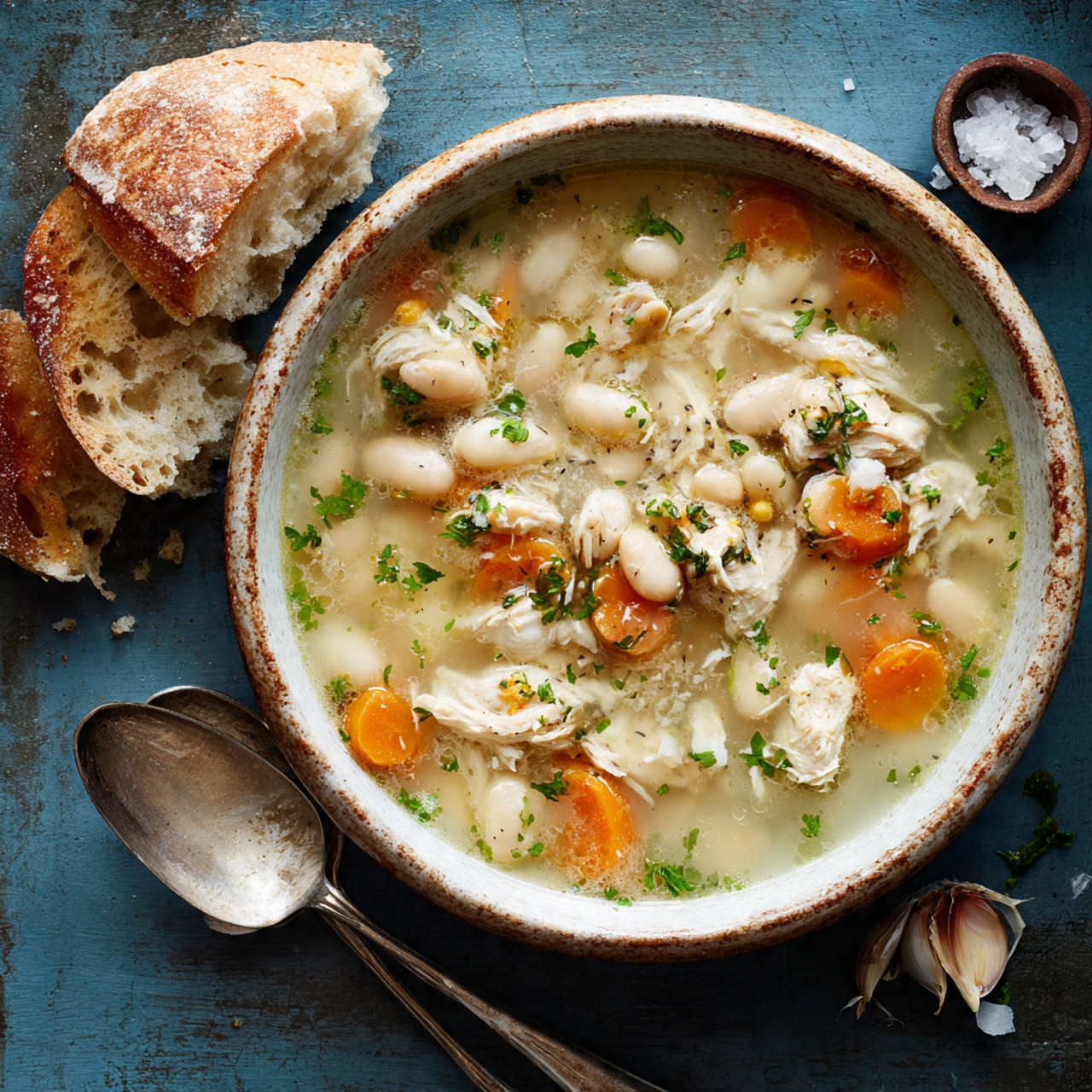 A warm and comforting white bean chicken soup made with tender shredded chicken, creamy white beans, and aromatic vegetables simmered in a flavorful herb broth.