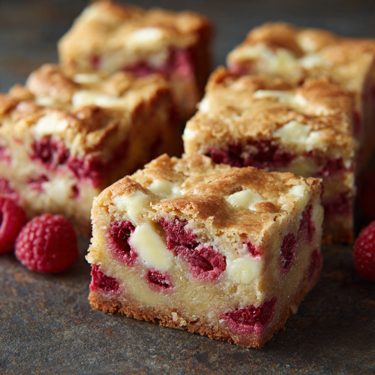 Rich and chewy blondies filled with sweet white chocolate and bursts of tart raspberries, creating a perfectly balanced fruity dessert.
