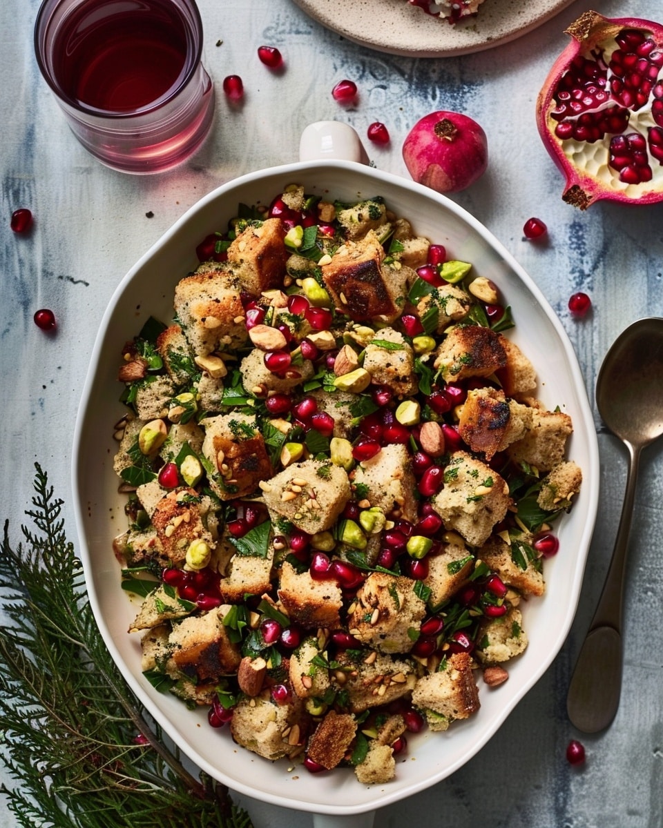 I love this stuffing because it breaks away from the usual heavy, overly herby versions. The zaatar adds a lemony, earthy flavor, the pistachios give it a buttery crunch, and the pomegranate seeds add juicy pops of sweetness. It’s a balanced side that’s just as comforting as traditional stuffing, but fresher and more exciting. It also looks beautiful on the table with its mix of colors and textures.